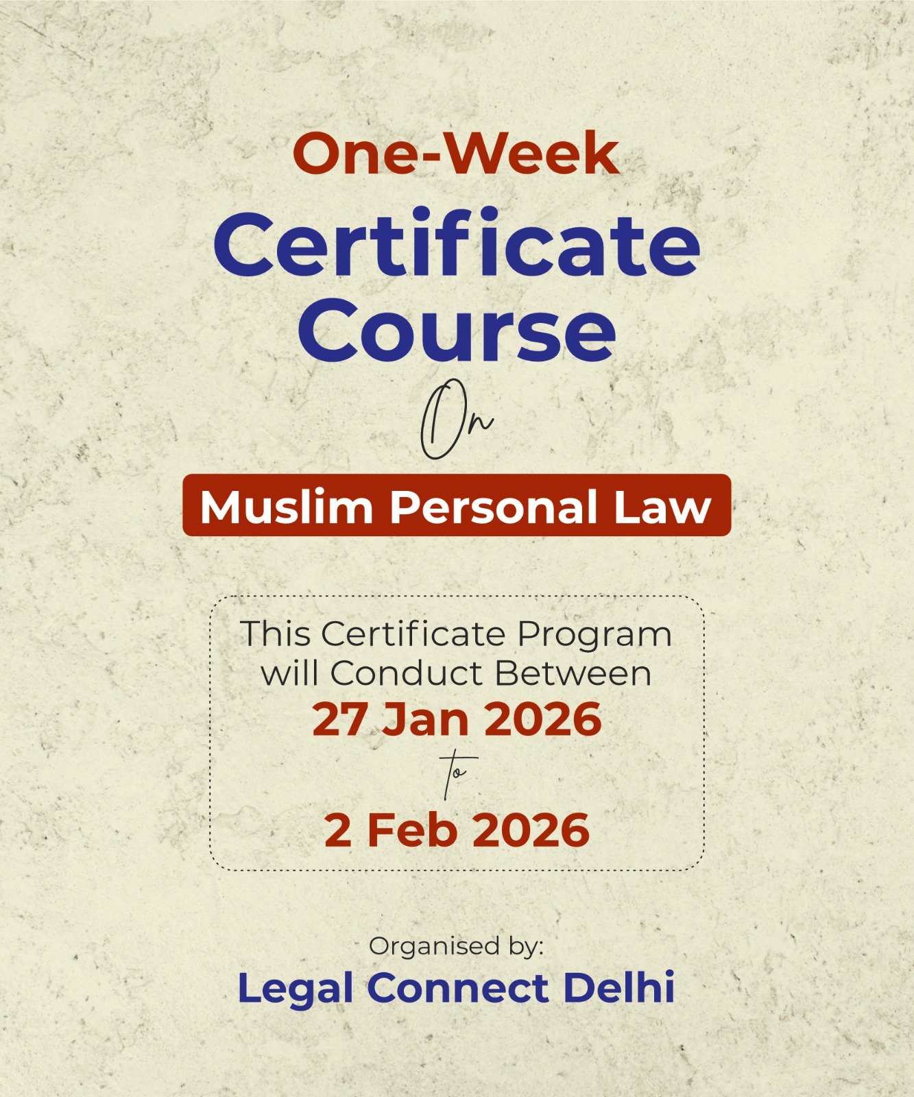 Legal Connect Delhi proposes to conduct a One-Week Certificate Course on Muslim Personal Law for law students, researchers, advocates, judicial aspirants, academicians, and all interested learners.